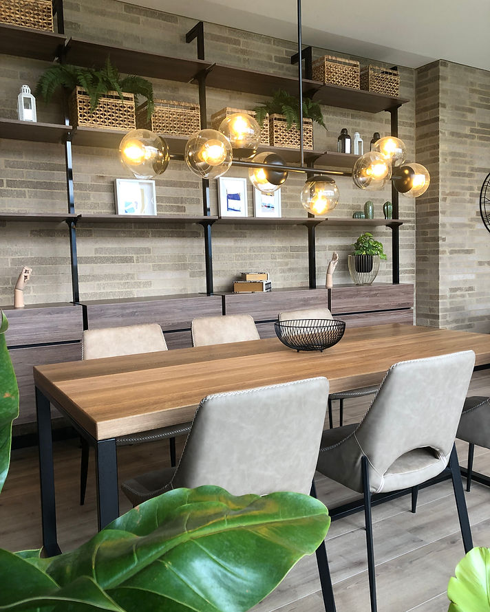 La selección de un mobiliario sobrio, una paleta cromática en tonos neutros con acentos terracota y el contraste de la madera con el metal acompañan el espacio de ladrillo expuesto creando un ambiente muy agradable y moderno donde también destacan las vistas exteriores de la ciudad que juegan con las plantas interiores.